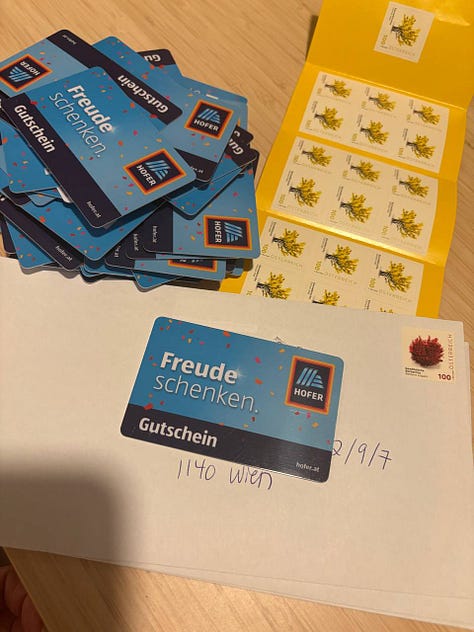To end on a positive note — this week we at Cards for Ukraine were able to distribute another 50 grocery store gift cards worth €50 each to Ukrainian families across Austria. The lovely photos and words of thanks have already started to flow into my inbox, and it makes me very happy to know we were able to do one tiny but meaningful good deed amidst all the terrible things happening around us. Thank you.