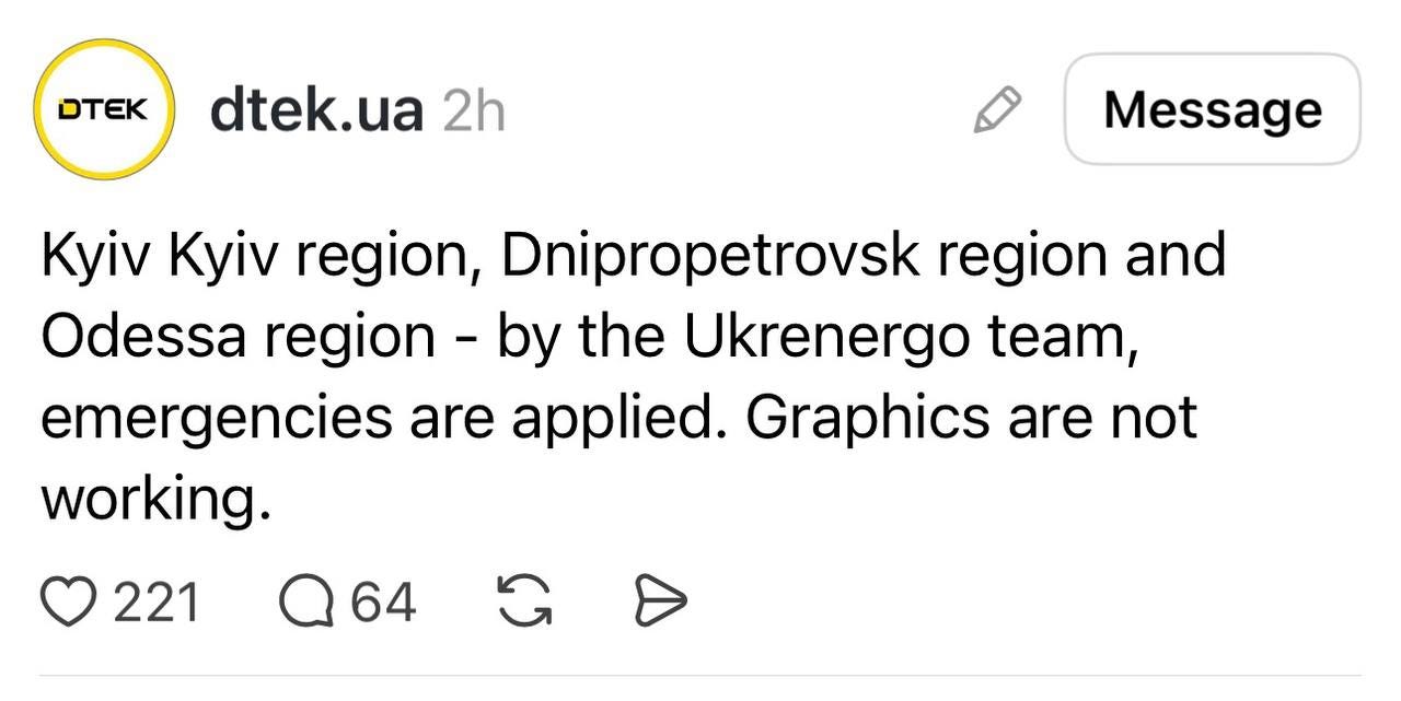 Ukraine’s electricity distributor is now warning that several major regions are without power and the usually graphics of rolling blackouts have been shelved. Now it is simply a blackout. The metro in Kyiv stopped working this morning with people inside. Two of three lines in Kharkiv are also not working.