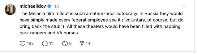I read online this week that Trump’s America still has a lot to learn about how to do propaganda right from Putin’s Russia. This is spot on. Let’s not also forget the reported $28 million Melania is reported to have been paid to make the film by Amazon. Exactly the way monolith corporations and oligarchs curry favour in autocratic countries. The only surprising part is the sloppy execution. But it will surely get better with practice.