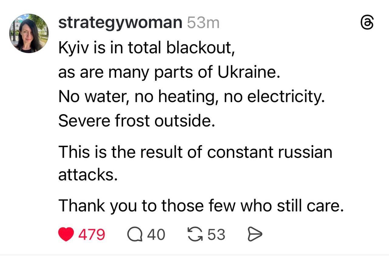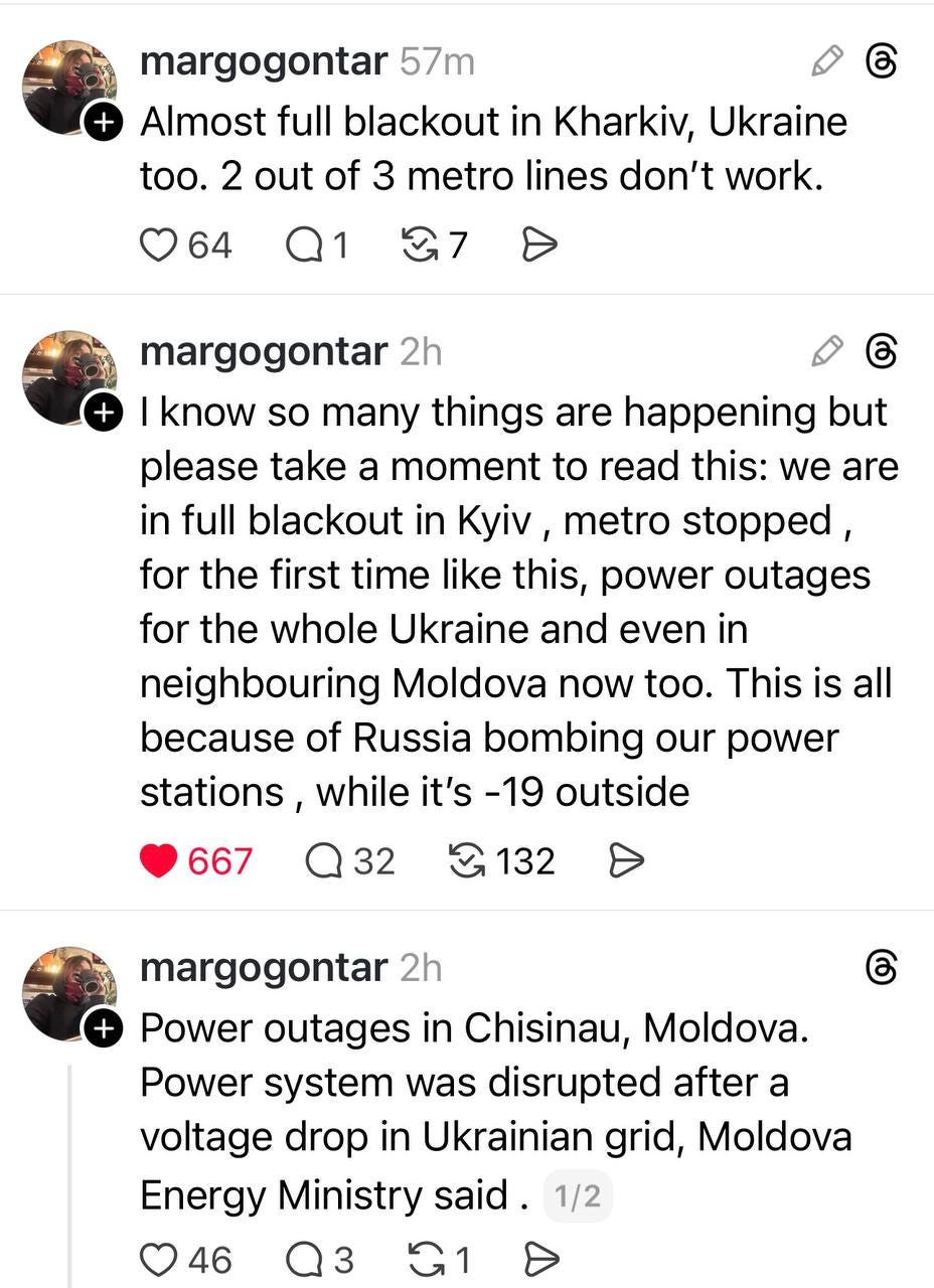 Ukrainians who manage to access the internet are now trying to tell the world what is happening, and today the news is incredibly bleak. The worst part is — there doesn’t appear to be any end in sight, not of the cold weather, and no hope for quick fixes to the infrastructure damaged by Russia’s relentless bombing campaign against Ukraine’s civilian popuation this winter. It is as if the battlefield has moved from the trenches of eastern Ukraine to the living rooms of apartment blocks unluckily located on Kyiv’s left bank of the Dnieper river (the entire region has no heat, for weeks now).
