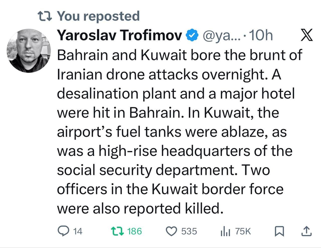 The situation in neighboring gulf countries has also not entirely quieted down. It is almost as if those who started this war forgot about all the negative consequenes to nearby economies of an active regional conflight. What are Dubai and Abu Dhabi if their airports cannot function on a normal schedule? Will American allies remain loyal while their countries are being targeted by Iran? It is almost as if no one asked any of these questions. Israel may be used to being in a semi-permanent state of war with its neighbors, but no one else is. Everyone else wants to enjoy the prosperity they have built.