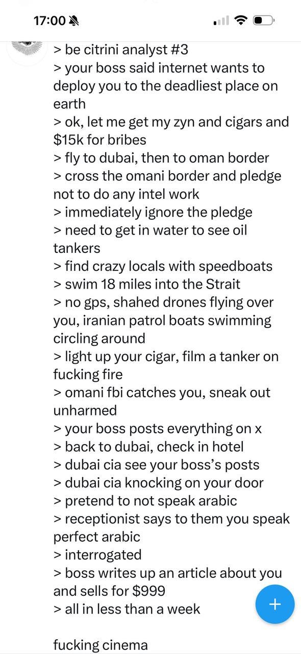 Skimming through X the other day I came across this insane story about an investment research firm which sent an analyst directly to the Strait of Hormuz, armed with $15,000 cash, some nicotine pouches, and cigars, to try and figure out from the source what if anything was actually getting through. The full article is behind a paywall: