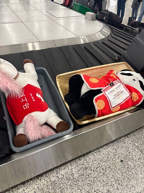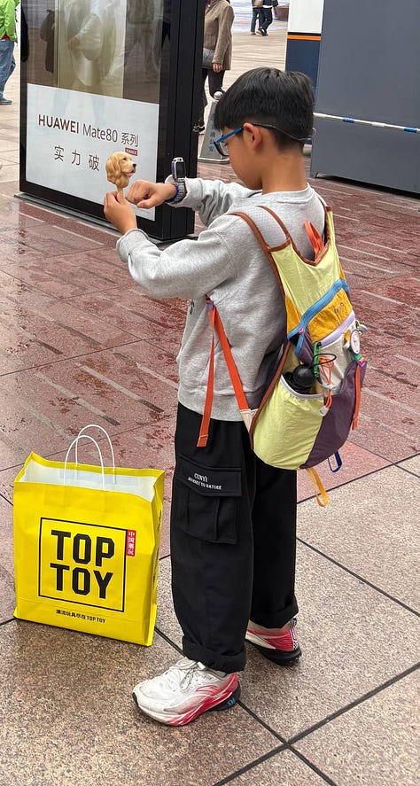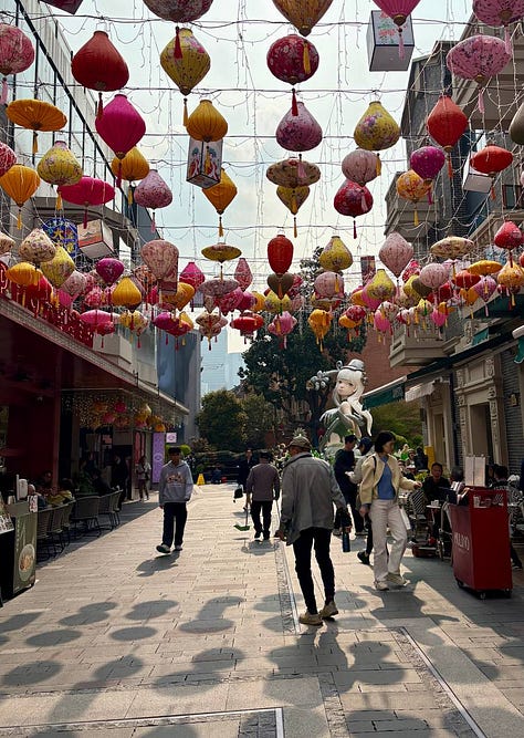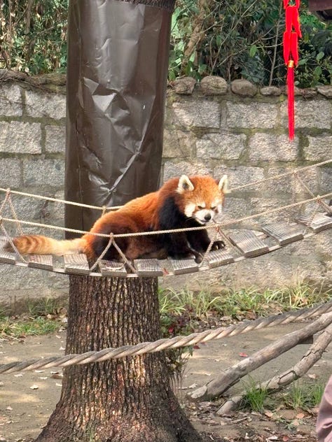 I also thought a lot about the construction bust you read about, and as we took two long subway rides through semi-agricultural outskirts to reach the wild animal park where my daughter was insistent on feeding a red panda apples like she had seen on TikTok (incidentally, the Chinese are all on their phones on the subway and all watching the Chinese version, RedNote), I did see some groups of empty apartment blocks never finished. I read recently this creepy article about some burials of ashes (!) now taking place in some empty blocks due to lack of affordable cemetary plots. To be fair, we were almost entirely in the city center, so I personally did not see a lot of evidence of this overconstruction. What I did see on existing construction sites were huge mini-villages of accomdation for construction workers in containers, like you see in the reports from Dubai. Which means laborers are being brought to the site and then living there the entire time they are working. That is, I assume, how you transform a country’s infrastructure at lightenting speed.