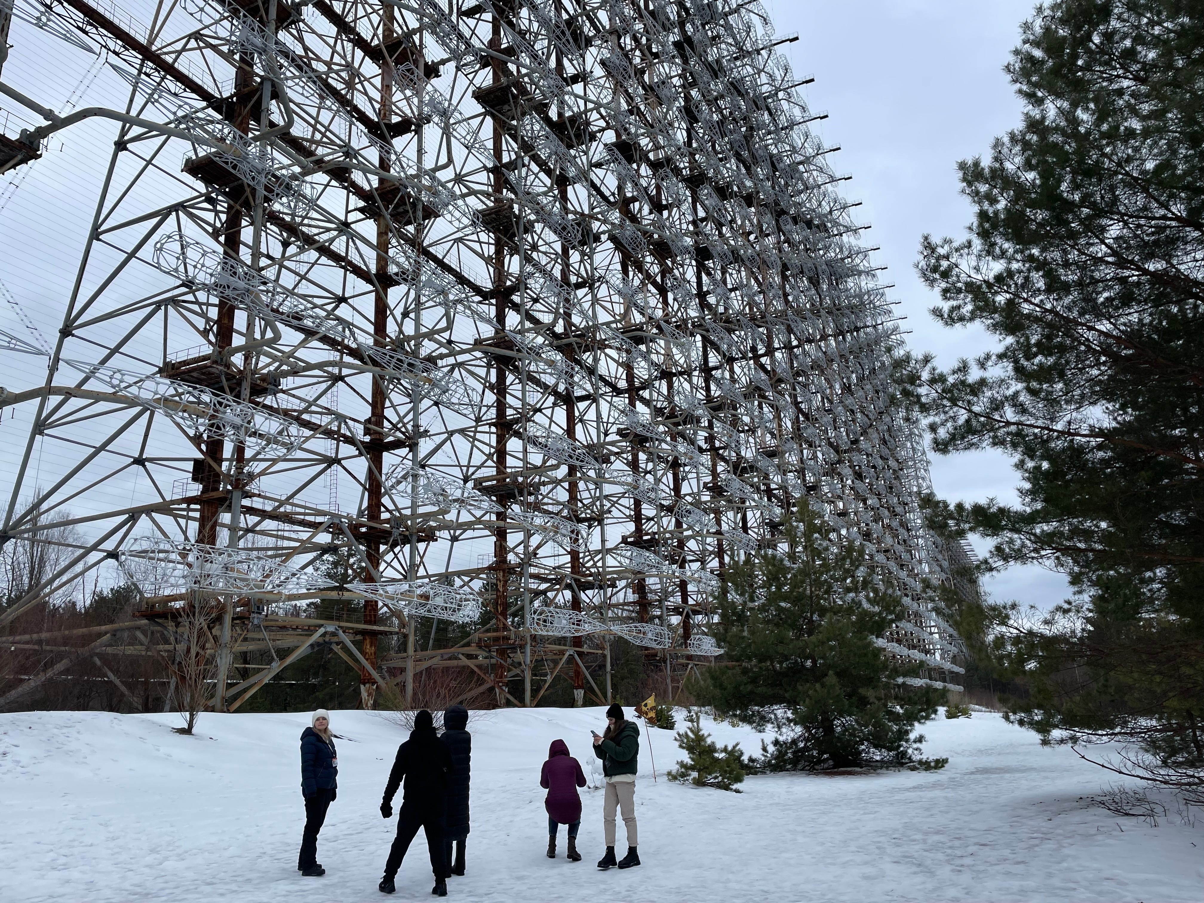 I took this photo on Feb 8 within the Chernobyl exclusion zone. It is now closed to tourists by the Ukrainian government over fears of an invasion from just across the Belarus border. The giant Duga radar, known colloquially as the Russian woodpecker, could detect a nuclear attack with 30 minutes notice. Behind the radar is an abandoned control room, with hand painted images of American nuclear warheads and rockets, with handwritten statistics under each one, the American rocket names written out in Cyrillic. We weren’t allowed to take photos inside.