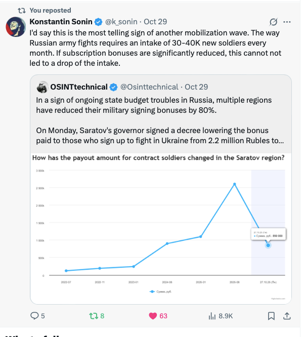 In the context of the new sanctions on Russian oil companies, I read this week that Russia is slashing the “sign on” bonuses in many regions awareded to men who volunteer for the army, which some believe might be a signal an actual mobilization will take place at some point in the future.